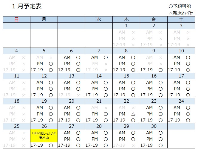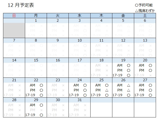 ご予約 ご予約状況 torisenpai 2025年12月17日 目次 12月のご予約状況1月のご予約状況12月のご予約状況 1月のご予約状況 フットの施術前1時間は食事をお控えください。 リアルタイムでの更新ではありませんので、空きと表示されていても予約済みの場合も ございます。 ご予約はメニューバーのお問合わせフォーム、ライン、または下記メールアドレスへお願いいたします。 believer.ieda@outlook.com 拠点決まりました 開業以来出張形式で施術させていただいておりましたが、 このたび拠点が決まりましたので、お知らせいたします。 古民家【お伽家(...