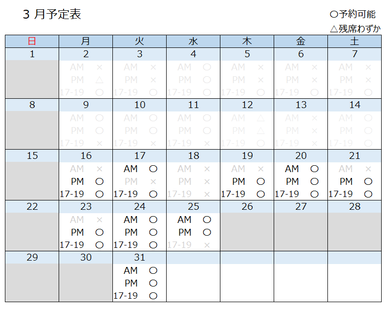 ご予約 ご予約状況 torisenpai 2026年3月15日 現在、3月分のご予約を受付中です。 ▶公式LINEで予約する リンク 🌿 月曜日、火曜日が比較的ご案内しやすいです。 今が整えるタイミングの方、お待ちしております。 ▶ご予約方法 LINEで「◯月◯日AM希望」と送るだけでOKです。 確認のうえ、折り返しご連絡いたします。